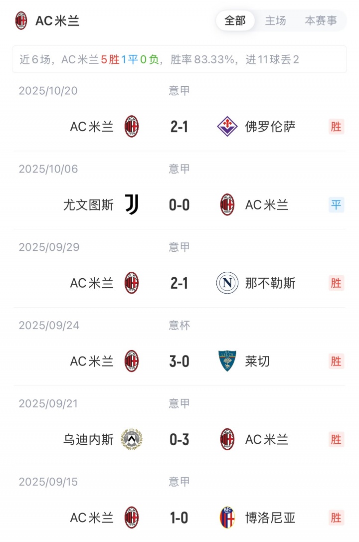 米兰5胜1平1负暂以16分领跑意甲,比萨3平4负排名垫底。