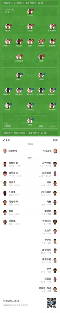 米兰替补:1-泰拉恰诺、37-皮塔雷拉、18-恩昆库、23-托莫里、24-阿特卡梅、27-奥多古、42-萨拉