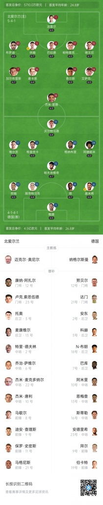 北爱尔兰首发:1-法雷尔、10-布罗迪·斯宾塞、5-休姆、4-巴拉德、17-帕特里克·麦克奈尔、15-德文尼、7-加布尔雷斯、16-麦卡恩、19-查尔斯、14-艾萨克·普莱斯、18-杰米·里德